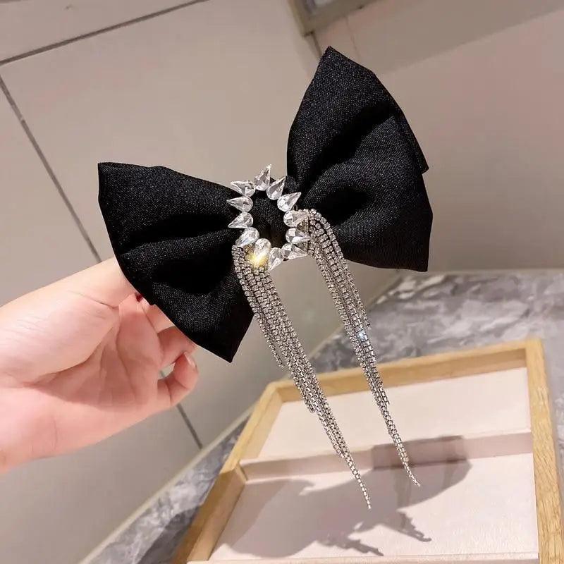 Fashion Black Shiny Crystal Bow Rhinestone Tassel Hair Clips For Ladies Luxury Design Bows Hair Accessories For Women