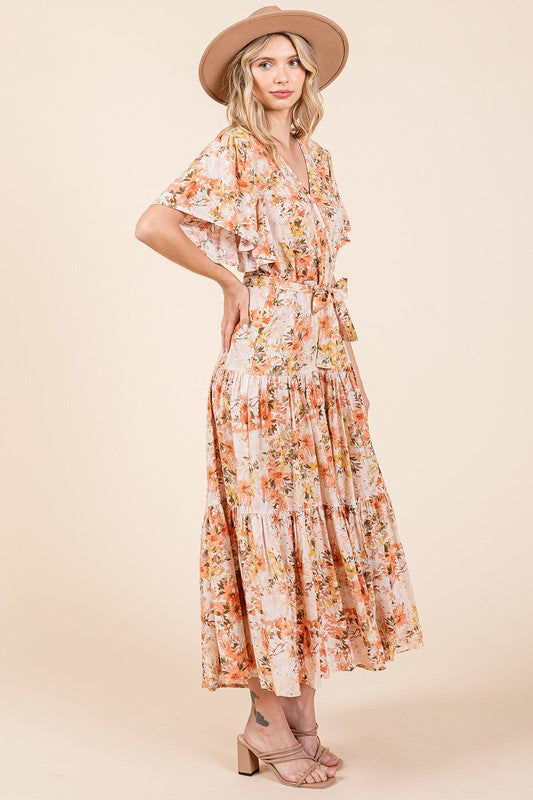 New Summer Floral Tie Waist Flutter Sleeve Tiered Dress – Graceful and Feminine Dress with Bohemian Charm and Flattering Tie Waist