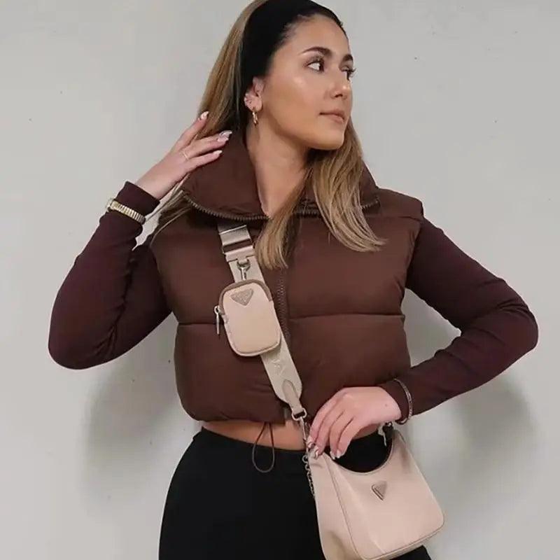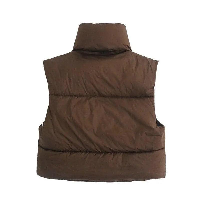 New Chic Lady Fashionable Women's Casual High Collar In Coffee Color Short Outwear Zippers Sleeveless Jackets Vest