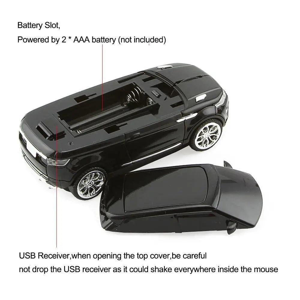 • BLUE HEADLIGHTS- The car mouse with the blue headlights it is very cool, 2.4GHz digital wireless transmission, operation distance is up to 10 meters. The batteries are inserted into the top of the car, and the receiver is placed into the battery slot side, just slide back the cover, you will see it, then insert two AAA batteries, you can use it well