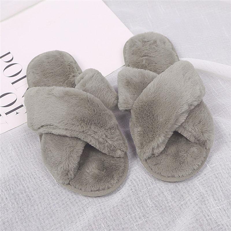 • COZY AND LUXURY SLIPPERS:  Fluffy fur upper with cross band design makes the slippers soft and fashionable. Plush fleece wraps your feet for warmth. Comfy man-made plush lining makes you feel like walking on clouds