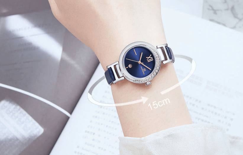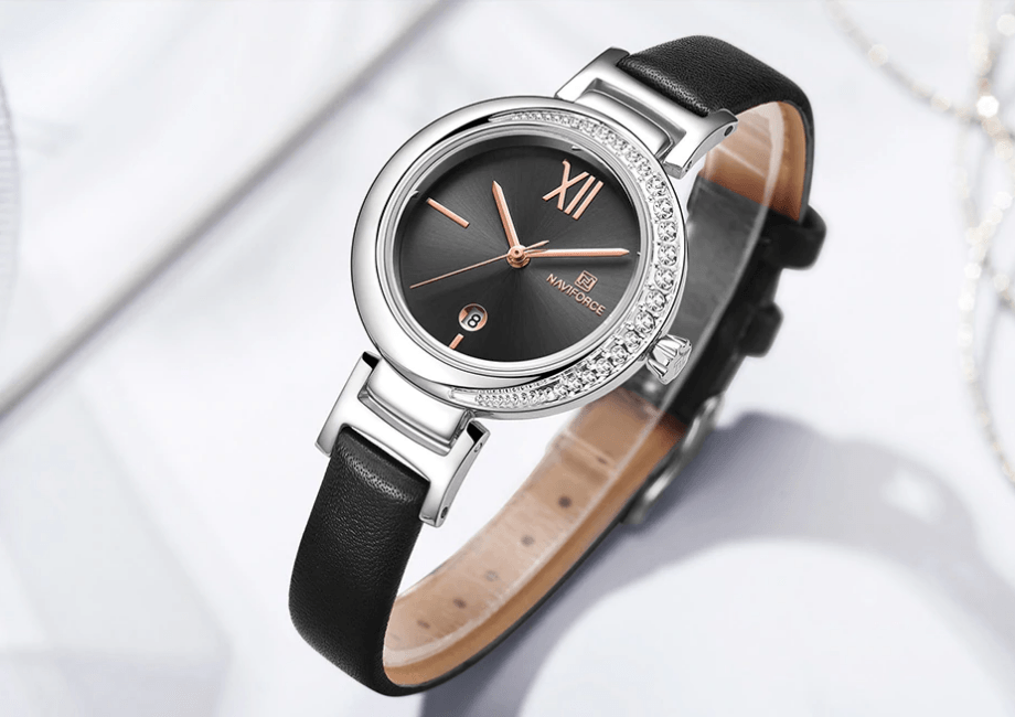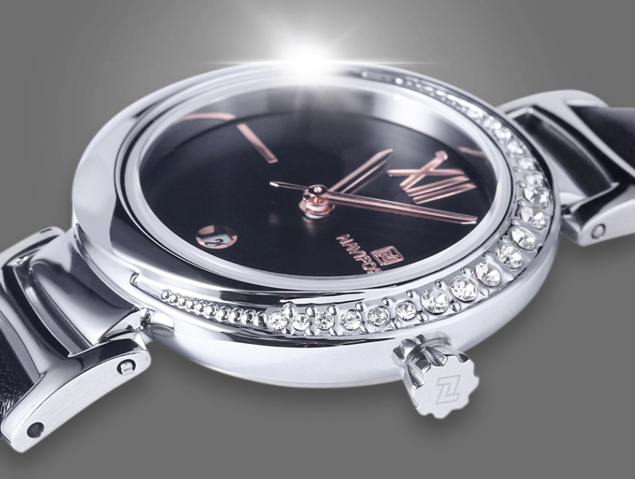 Women's Modern Wrist Watch With Leather Belt Steel Case With Shining Background And Zircons On Dial Perfect Gift For Her