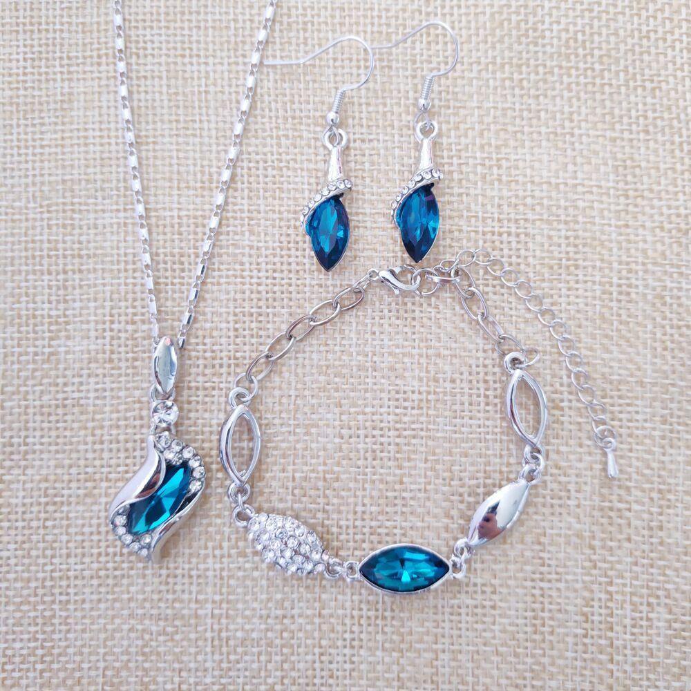 Luxury Elegant Juwelery Set For Ladies IN Blue Crystal Stone Wedding Jewelry Style For Brides Silver Color Necklace Set For Women