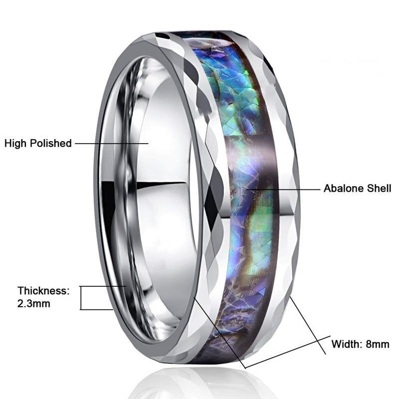 • SPECIFICATION- 8mm width, genuine tungsten carbide, dazzling abalone shell with unique polished faceted edge