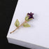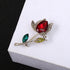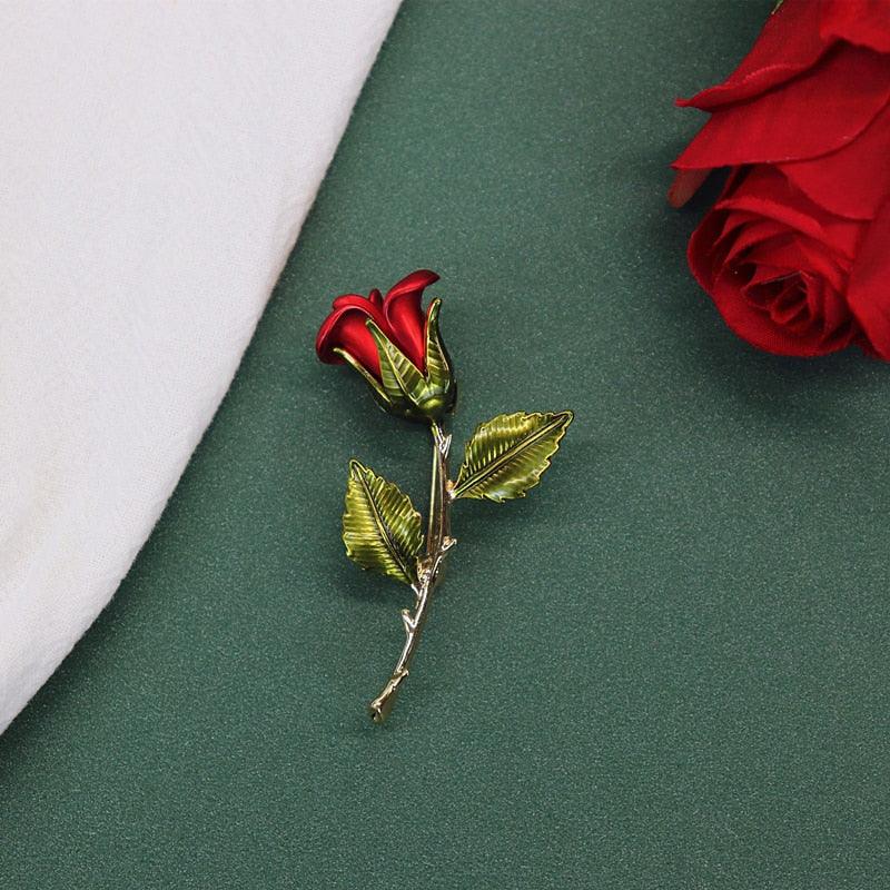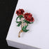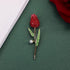 • BEAUTIFUL DESIGN - Stunning red rose and green leaves brooch containing encrusted rhinestones on the petals, and a gold tone metal alloy base.