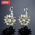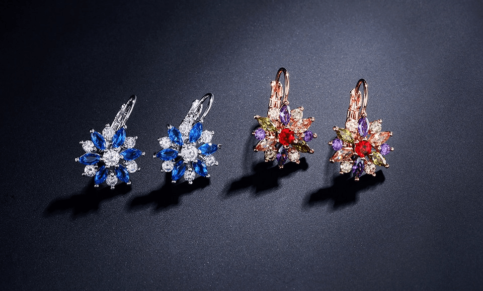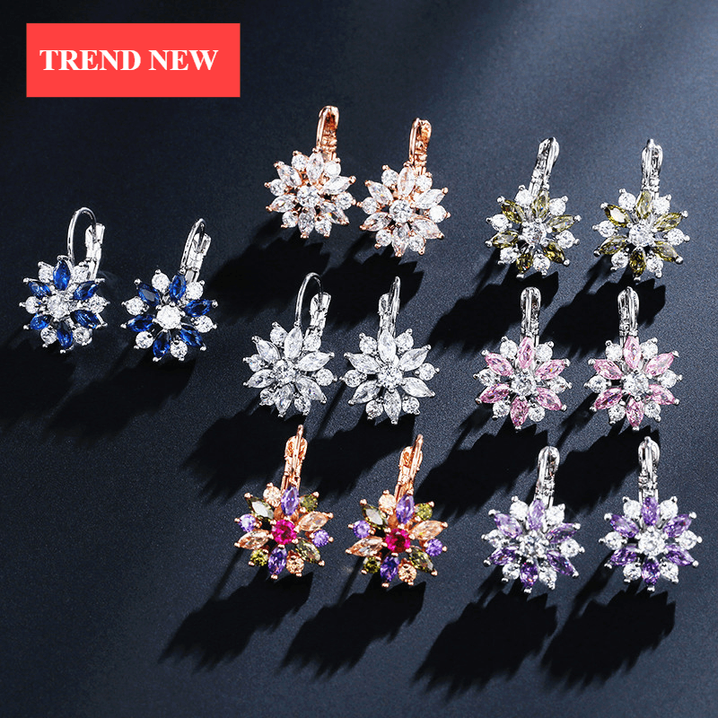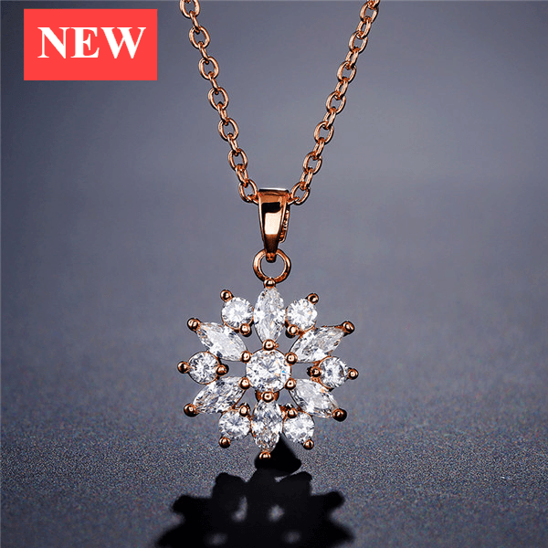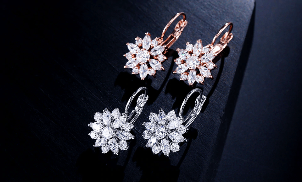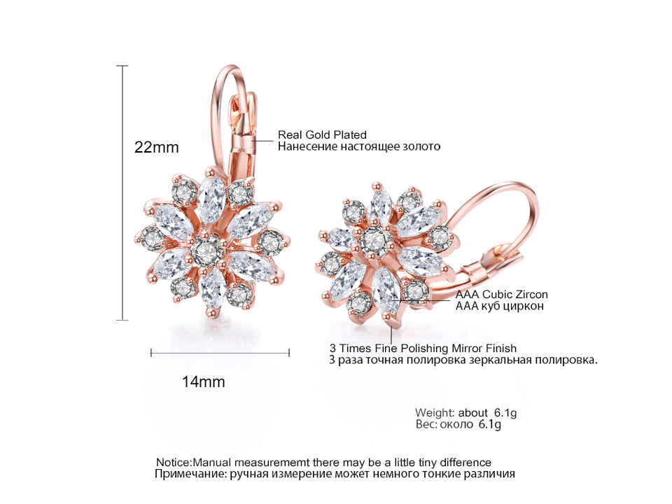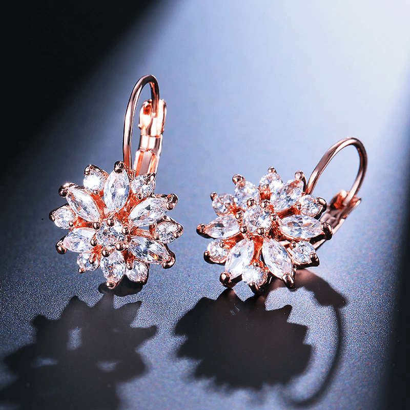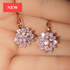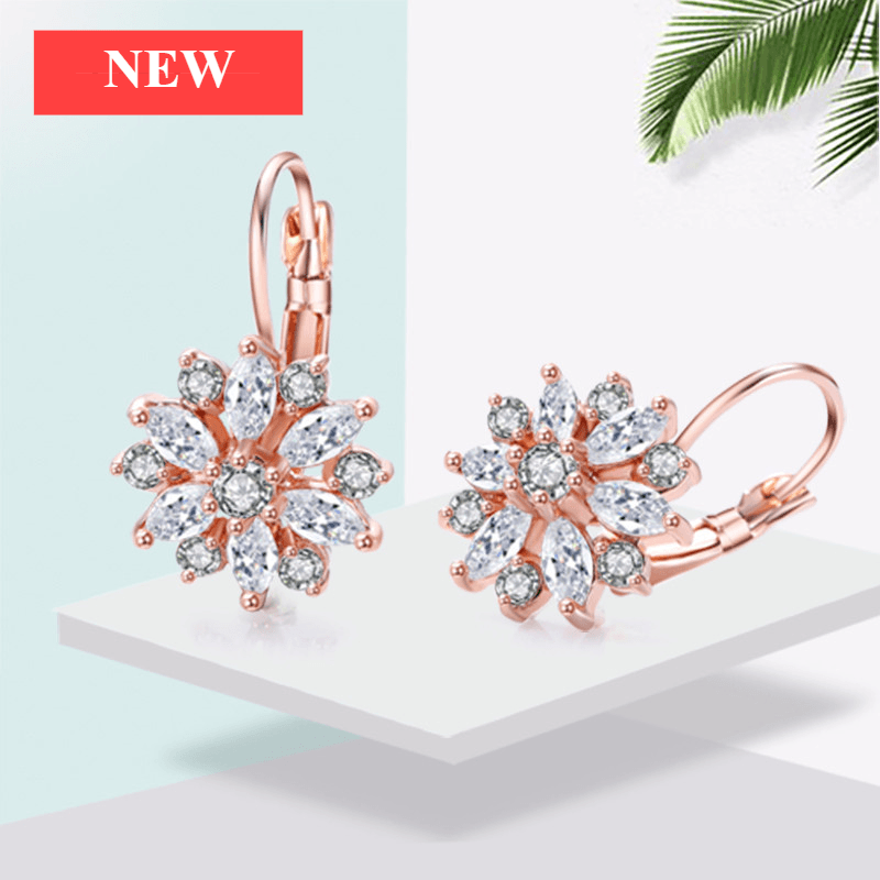 Luxury Modern Handmade Fashion Rose Gold Color Hoop Earrings In Flower Clear Crystal Earring Design and Necklace Ring set for Women.