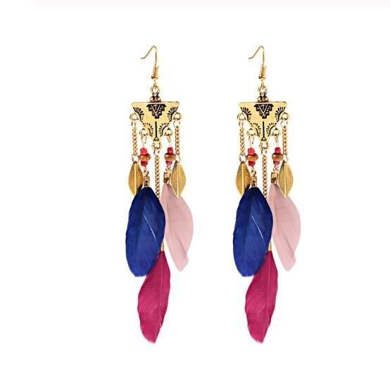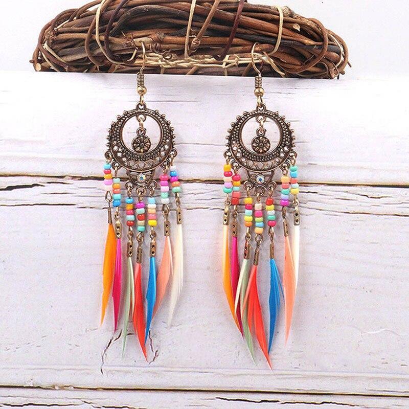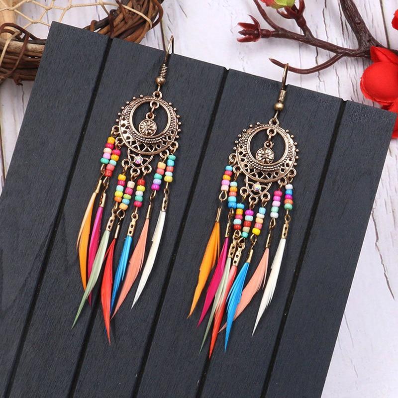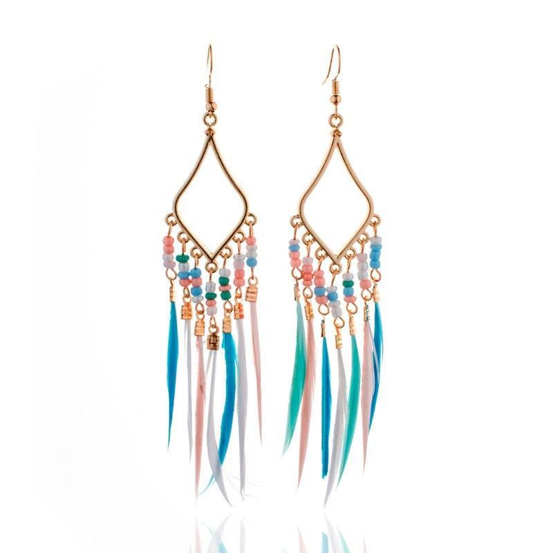 Handmade Modern Elegant Golden Silver Color Ethnic Acrylic Luxury Rainbow Beads Feather Drop Earrings for Women Boho Jewlery