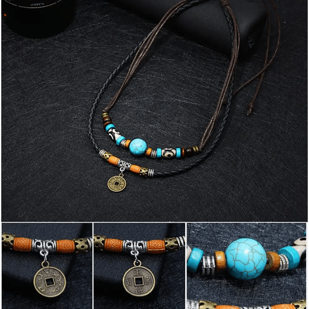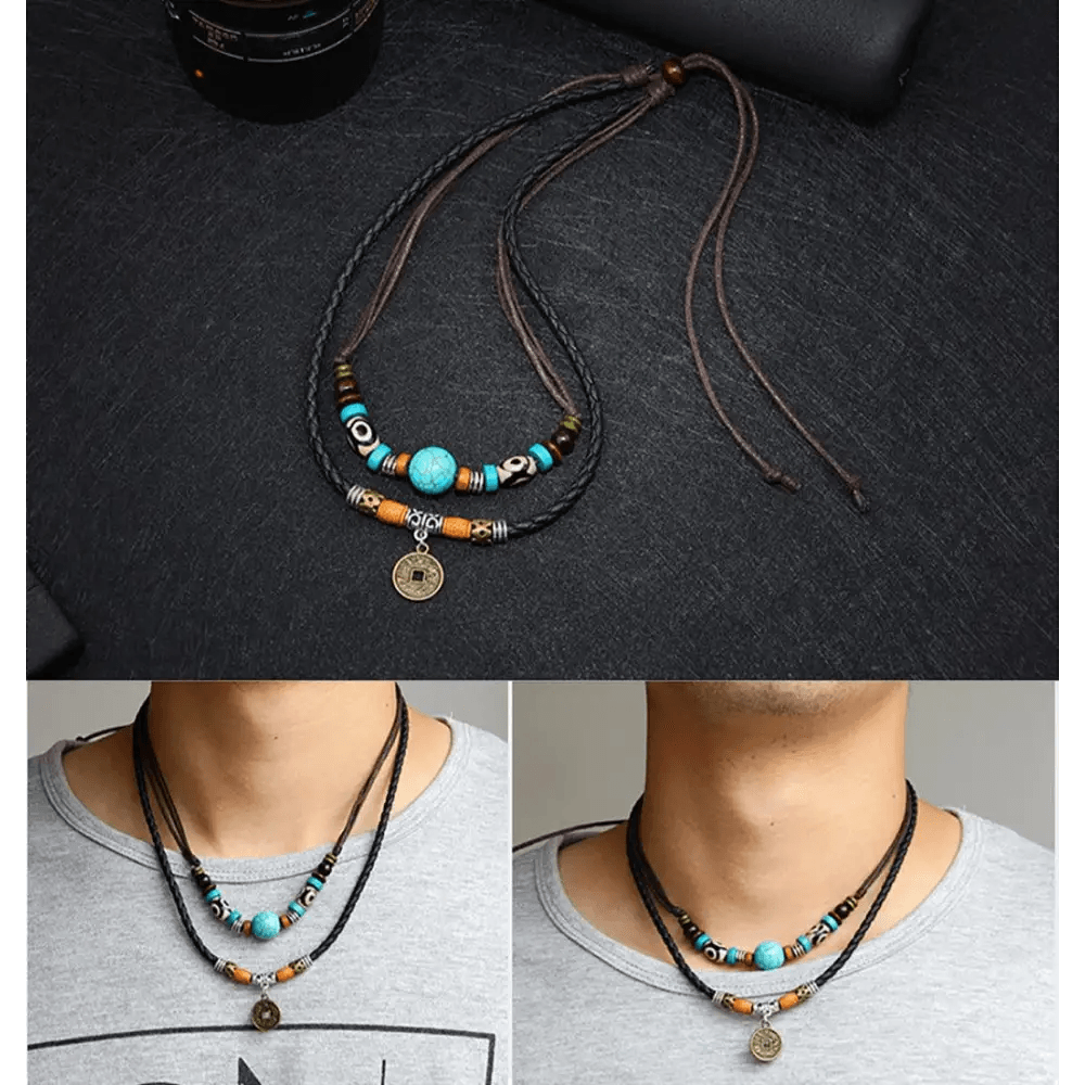 Leather 2 Layers Rope Vintage Coin Necklaces Retro Style Layered Pendant Lucky Charm Unique Men Necklace