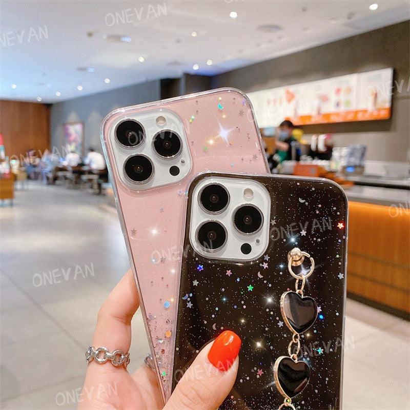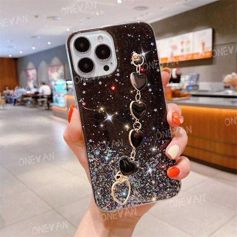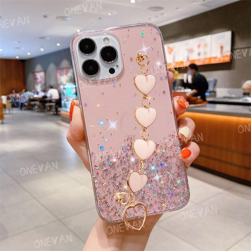 Luxury Glitter Wristband Love Heart Bracelet Phone Case For iPhone 14 13 12 11 XSMax X XR 12 mini 7 8 14Plus Holder Bumper Cover Cute Luxury Plating Soft Flexible with Love Heart Chain Bracelet Hand Strap Women Protective Cover