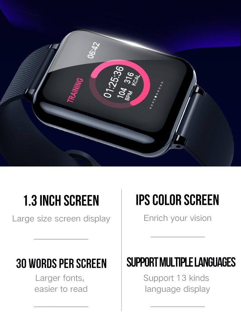 • POWERFUL FUNCTION: Smart watches with color screen support for calls reminder, SMS alerts push, remote camera, music control, heart rate monitor, blood pressure monitor, sedentary reminder, calorie calculation, step counter, stopwatch,custom screensaver,more exercise mode like walking, running, cycling, skipping, badminton, basketball, football.