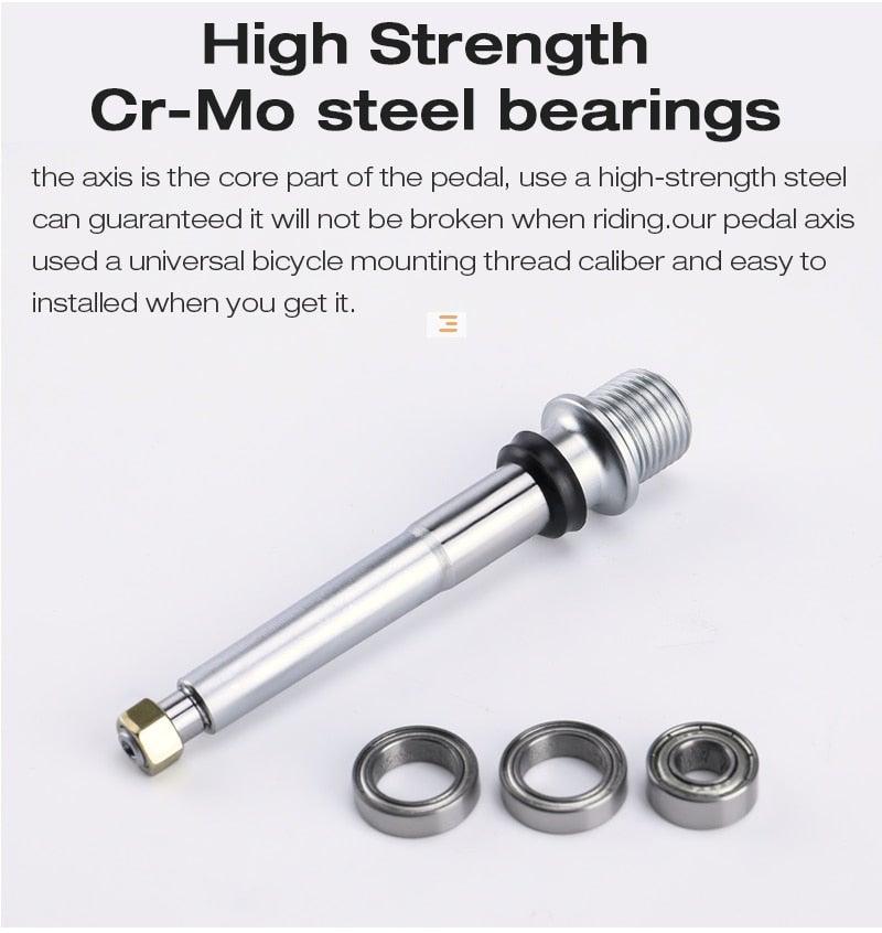 • SUPERIOR SMOOTH BEARING: The lubricated sealed DU bearing platform pedals feature sturdy and durable, keep pedals spin smooth and without noise. The spindle composite of chrome-molybdenum steel material, Carbon fiber bushing outside of the spindle makes it more durable and anti-corrosion.