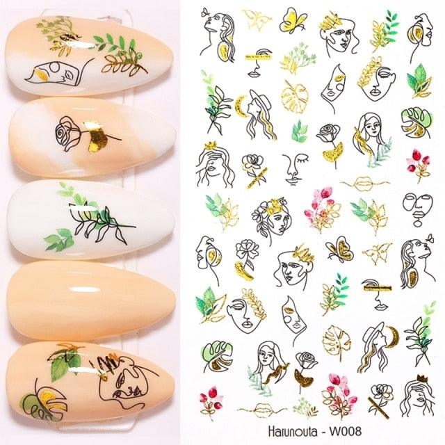 Summer Glitter Nail Decals Stickers Gold Black White Leaf Manicuring Foils Geometric Slider Nail Art Adhesive Decor Adhesive 3D Wave Design Decoration for Women Girls Art Stickers Decal Decoration Metallic Curve Strip Line Nail Decor
