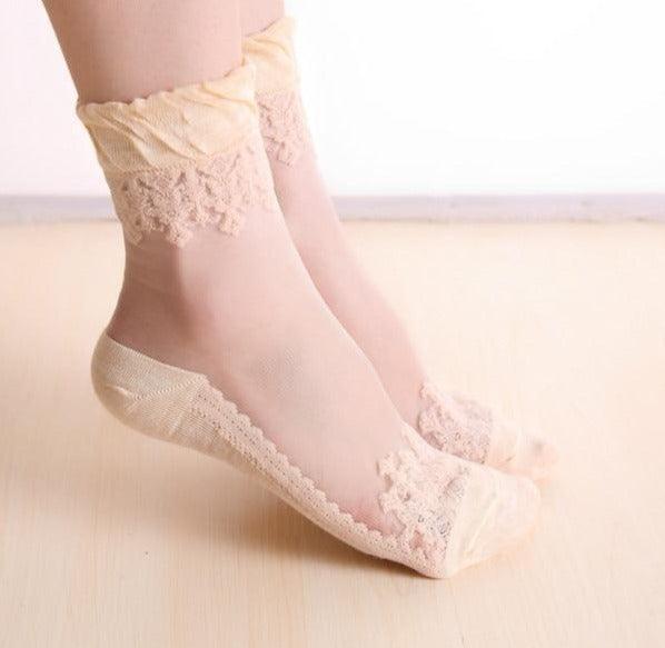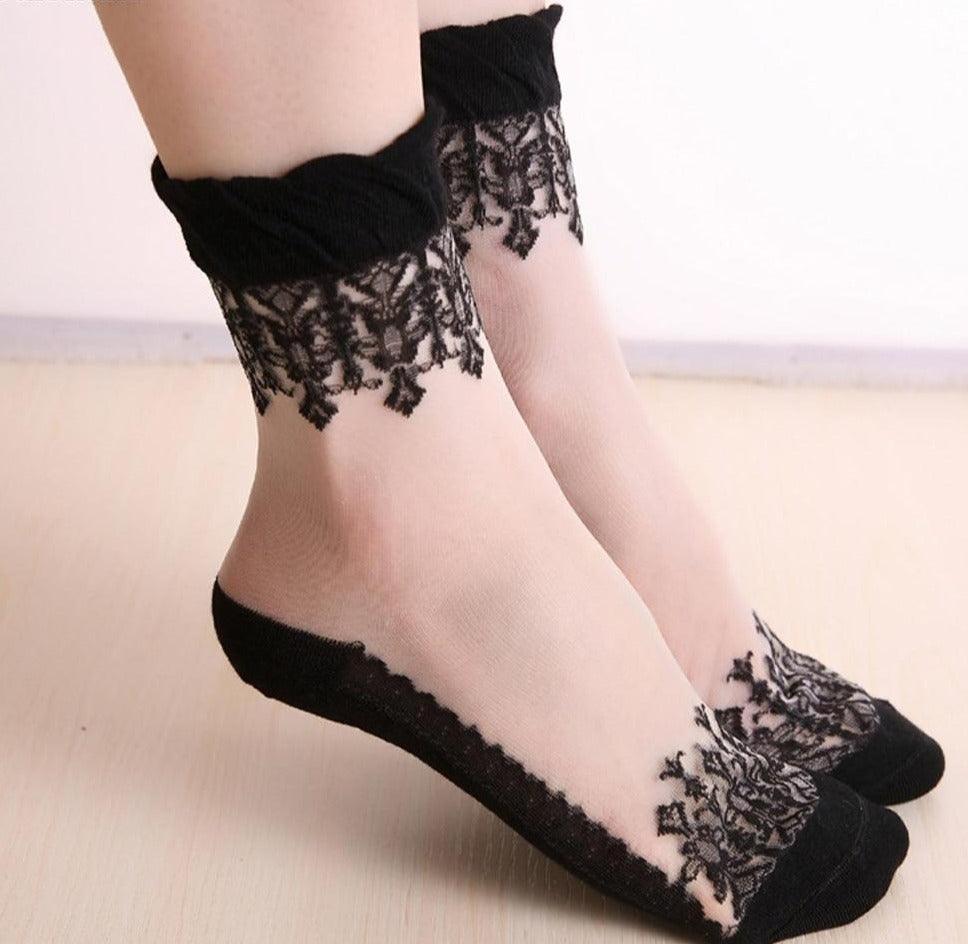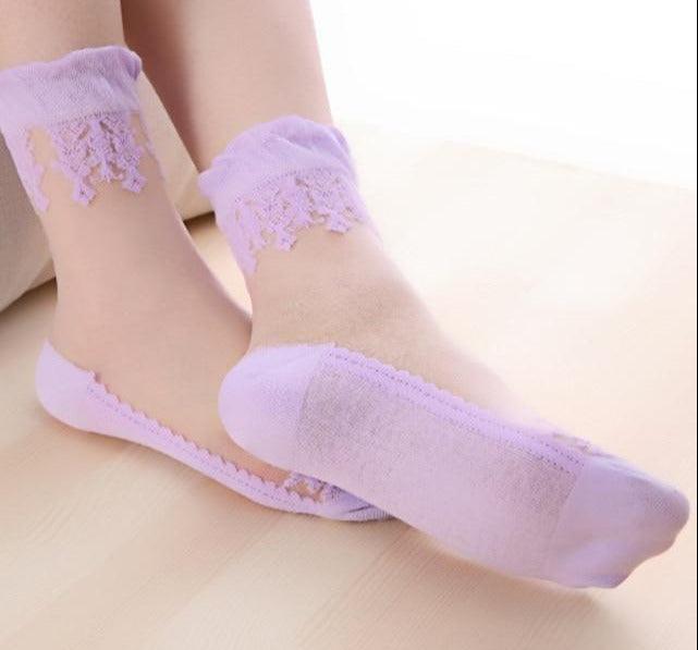 Summer Ladies Lace Embroidery Silk Transparent Glass Crystal Stretch Women Socks Breathable See Through Socks Ankle Socks For Women