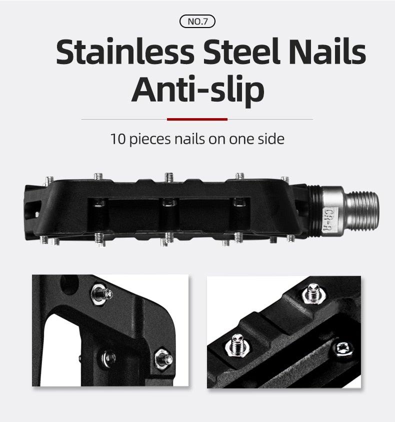 • GREAT GRIPS: Anti-skid nails on each side provide more secure on the pedals and hold your feet in place. Even if they are covered with a thick layer of mud after a muddy ride, you don't worry your feet slipping off the pedals.