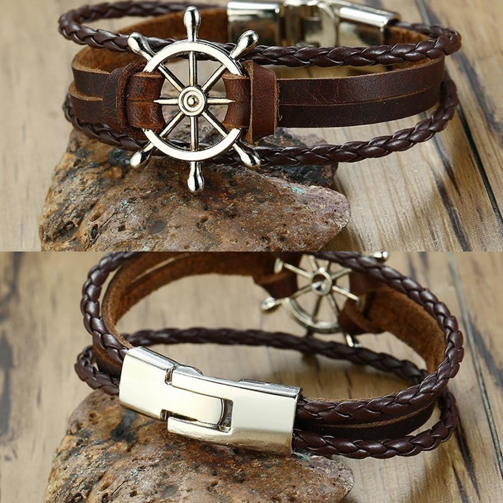 Handmade Sailor Anchor Ship Bracelet In Vintage Retro Rudder Charm Bracelet for Men Made from leather and Stainless Steel for Man