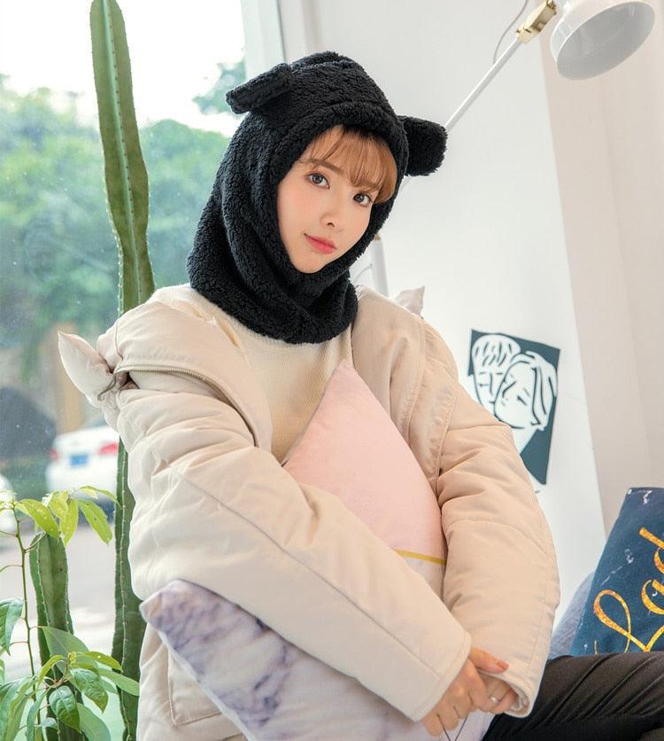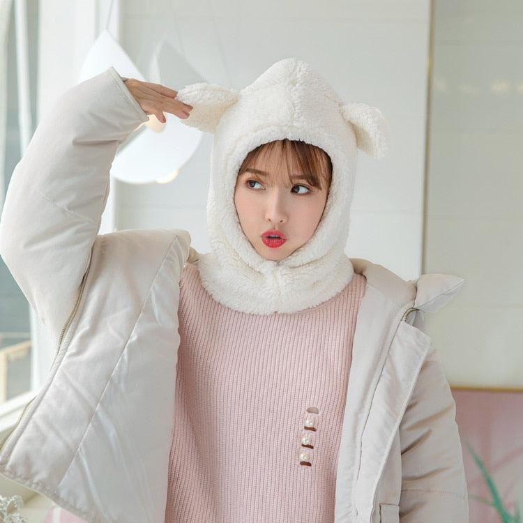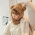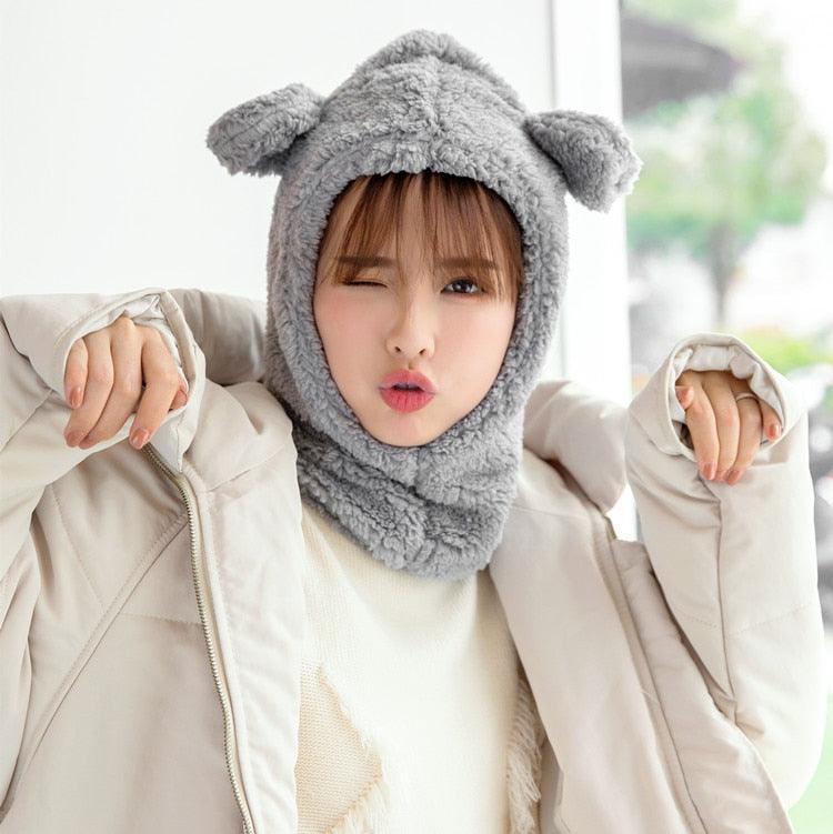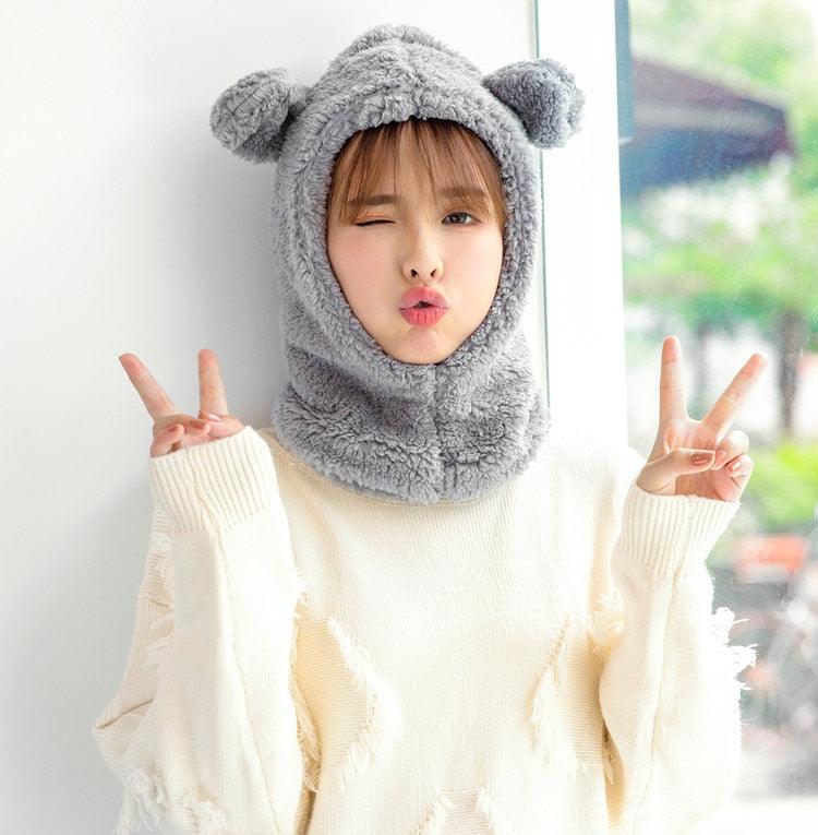 Winter Cute Bear Ears Warm Hat Windproof Neck Scarf Cap Student Women Plus Cashmere Cap Unisex Keep Warm Sports Beanies Knitted Headgear Face Hooded Cowl Neckerchief with Drawstring Soft Balaclava Pullover Knitted Beanie
