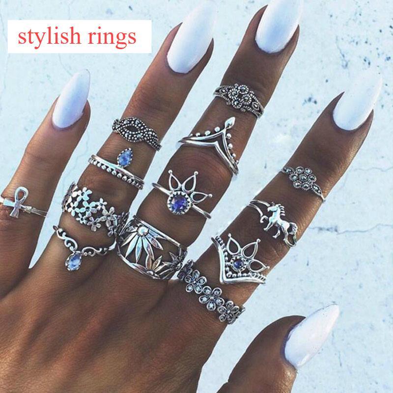 Bohemia Antique Luxury Silver Color Crown Elegant Flower Unicorn Carved Rings Sets Great Knuckle Rings For Women Jewelry