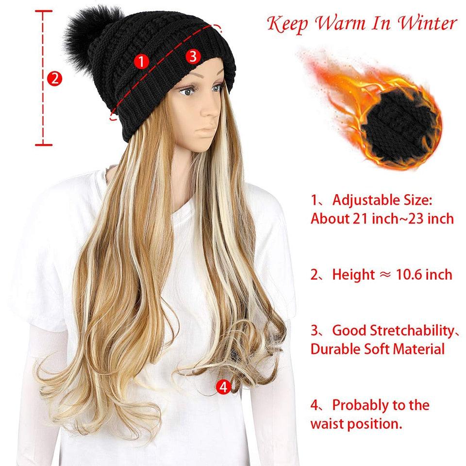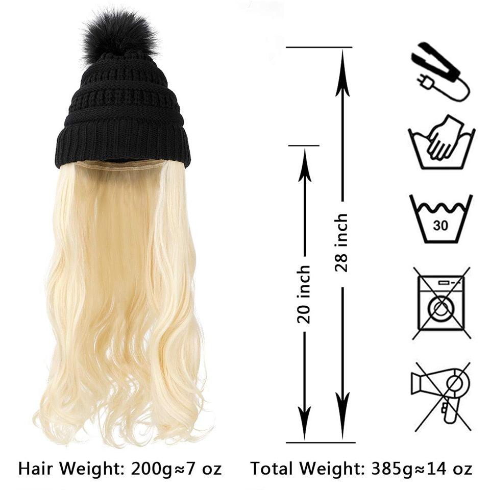 • Material : Knit beanie hat with long wavy hair is 27.6inch long. The hair extension is 20inch, and weight about 7oz. It is made of high quality synthetic fibres. The hair piece is soft and looks real. And it's got the perfect amount of wave. 100% cotton knit beanie hat is super soft and comfy.